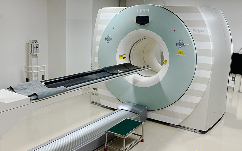 当院には、SPECT装置1台、PET-CT装置1台が設置されており、年間3000件程度の核医学検査を実施しています。これらの装置では、血流や代謝に応じた放射性医薬品の人体内での分布を画像として得ることができます。必要に応じて、運動や薬物投与による負荷検査を実施することもあります。さらに近年では、α線・β線を放出する放射性同位元素が持つ細胞障害性を腫瘍の治療に用いるようになりました。標的アイソトープ治療(RI内用療法)は、腫瘍に対する新しい治療選択枝として期待されています。